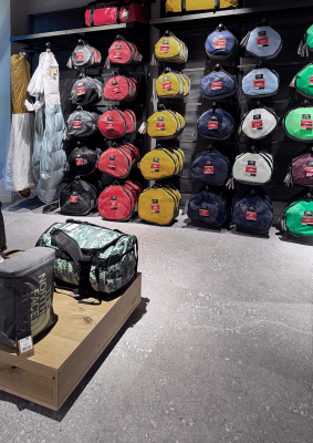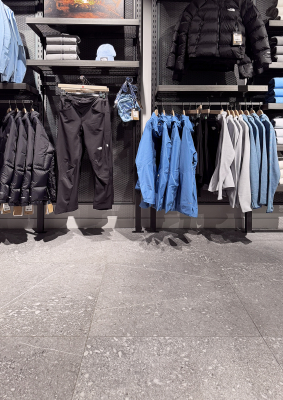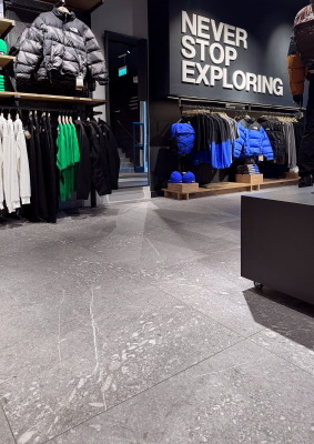 The retail space is structured around a continuous floor that provides solidity and character to the interior. Pietra di Gré’s richly textured stone-like surface creates a natural appearance that complements the brand’s outdoor identity, helping to shape a contemporary and refined atmosphere.